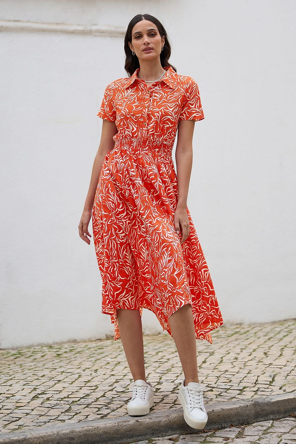 Vibrant midi dress in coral with a tropical leaf print. Features a button-up shirt design and a soft, lightweight modal fabric. The midi dipped hemline adds a flowy and feminine touch. Ideal for summer getaways.