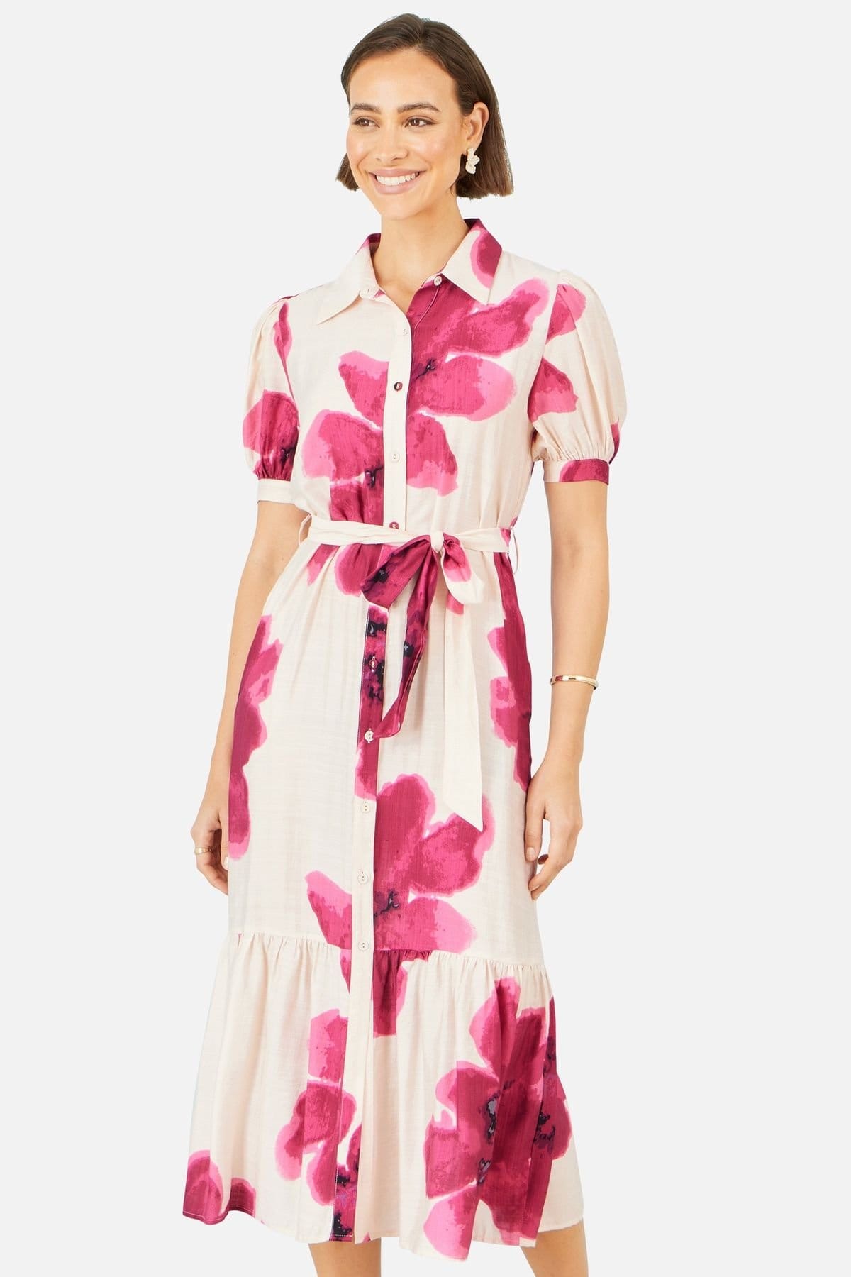 Vibrant fuchsia floral print shirtdress with a button-through front, short puff sleeves, and a matching self-tie belt. The tiered skirt adds a soft, feminine touch. Ideal for casual and semi-formal occasions.