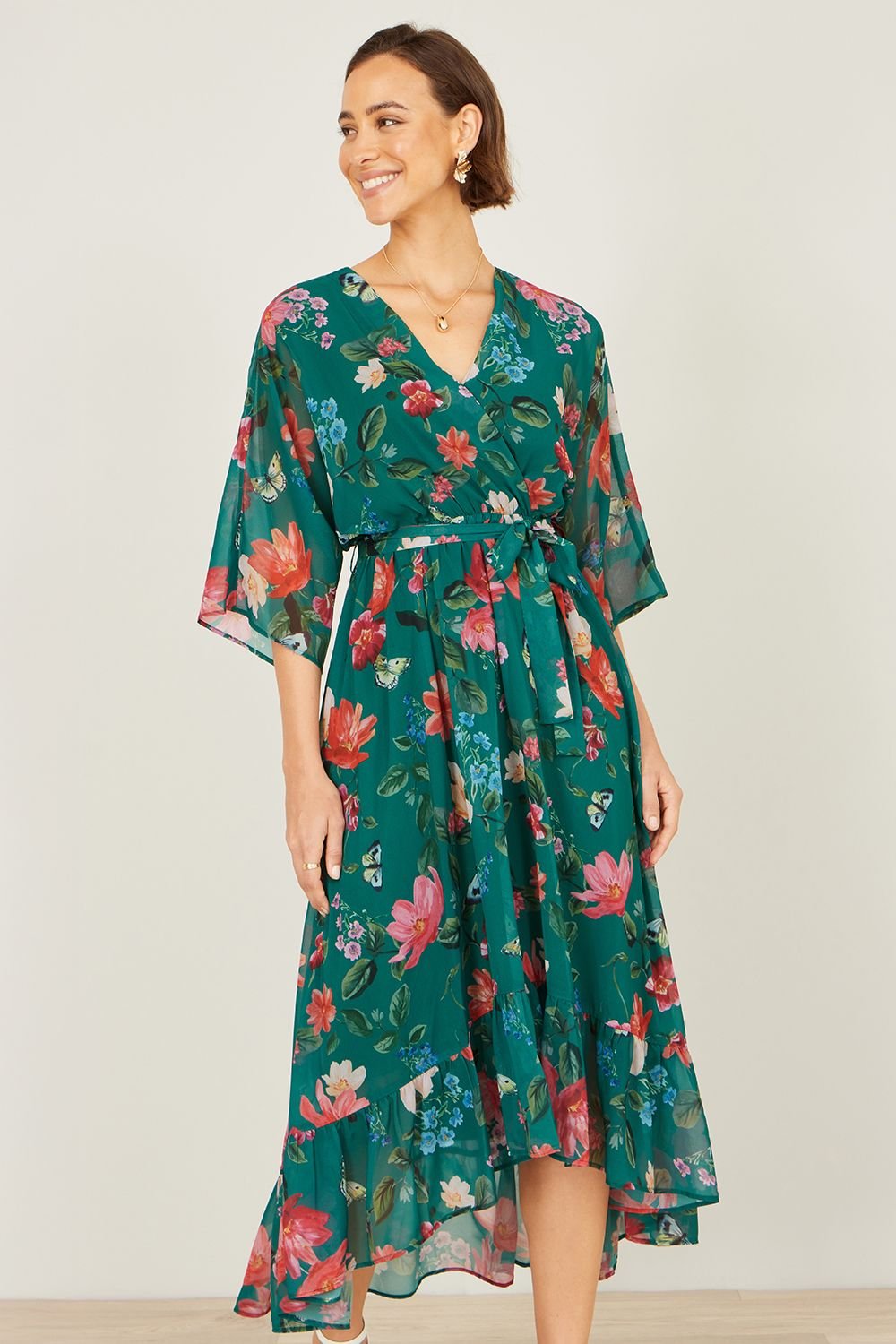 The Yumi Green Floral Kimono Wrap Dress With Dip Hem is available in sizes 10, 12, 14, 16, 18, 20, 24, 8.