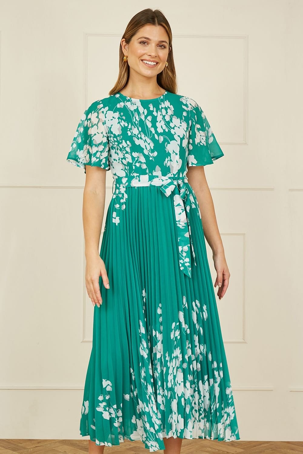 The Yumi Green Floral Pleated Midi Dress is available in sizes 10, 12, 14, 8.