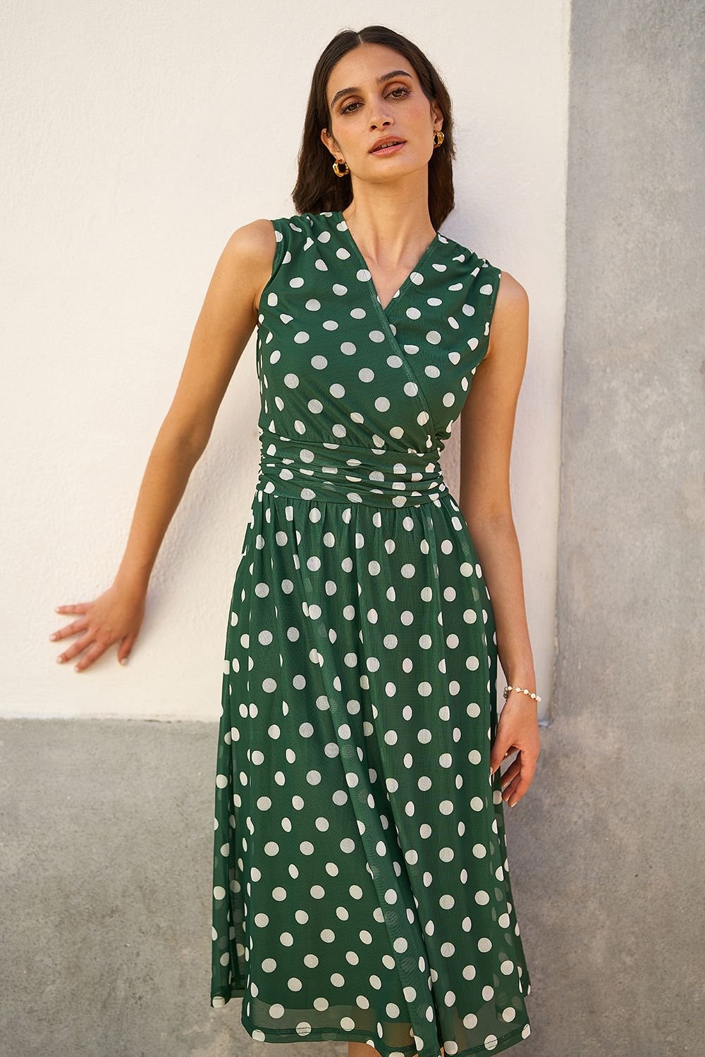 This green polka dot mesh wrap skater dress by Yumi features a V-neckline and sleeveless design. The ruched waistline conceals pockets, adding a touch of functionality. Perfect for casual outings or summer events.