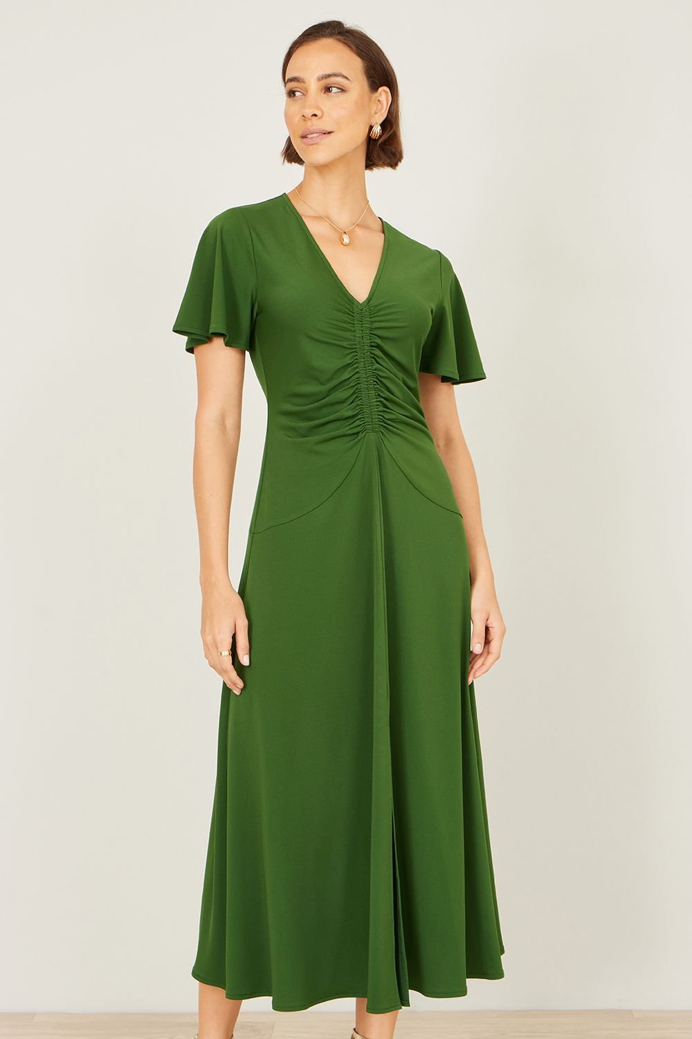 The Yumi Green Ruched Front Stretch Midi Dress is available in sizes 10, 12, 14, 16, 8.