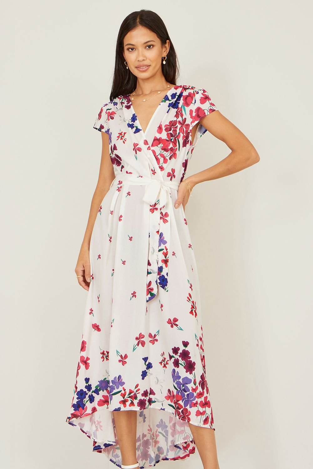 The Yumi Ivory Floral Wrap Midi Dress With Dip Hem is available in sizes 22, 24.