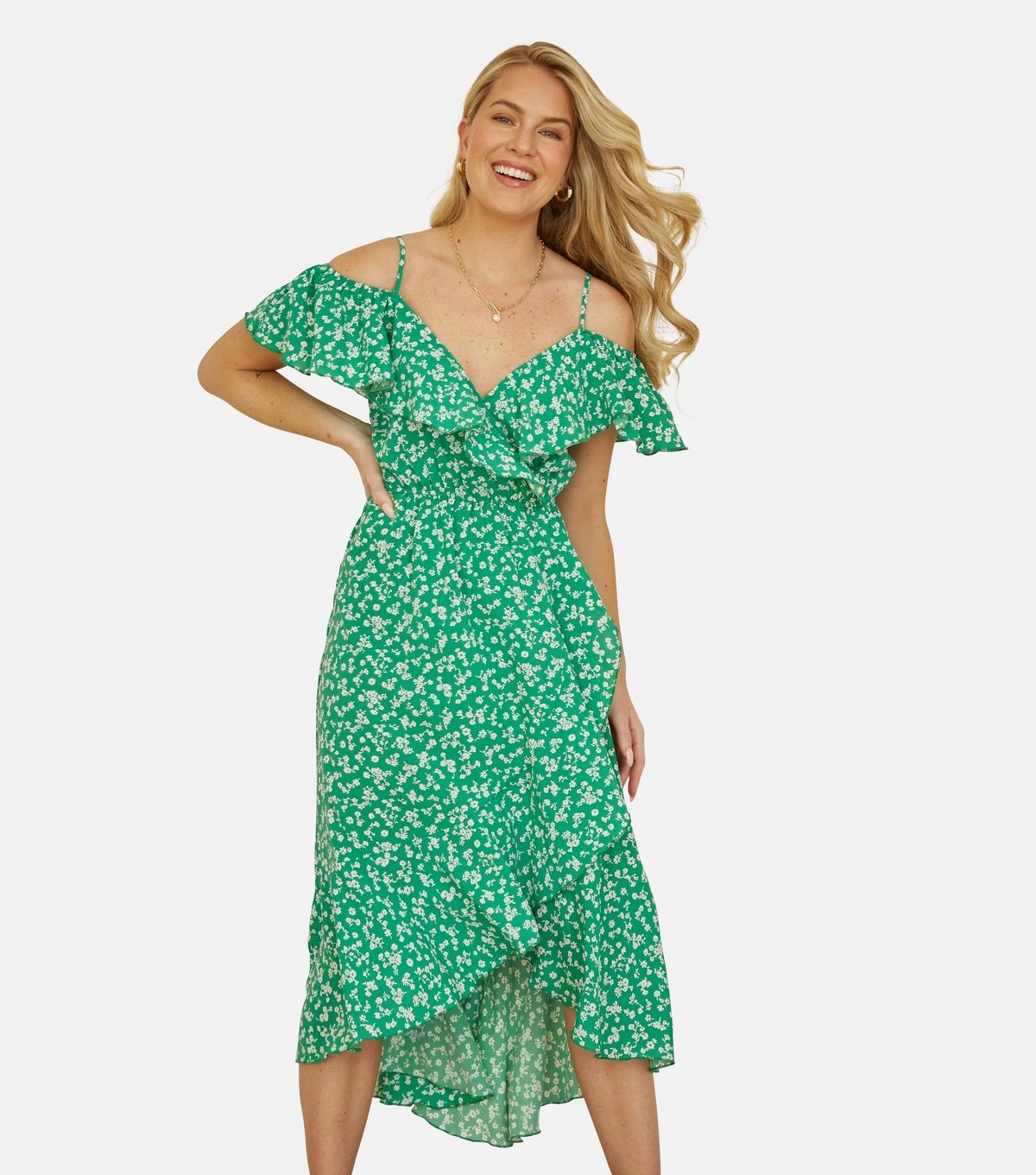 Charming light grey floral print midi dress by Yumi. Features a bardot neckline, adjustable thin straps, and an elasticated waist. The high-low waterfall hem and ruffle trim add a playful touch. Ideal for casual outings or garden parties.