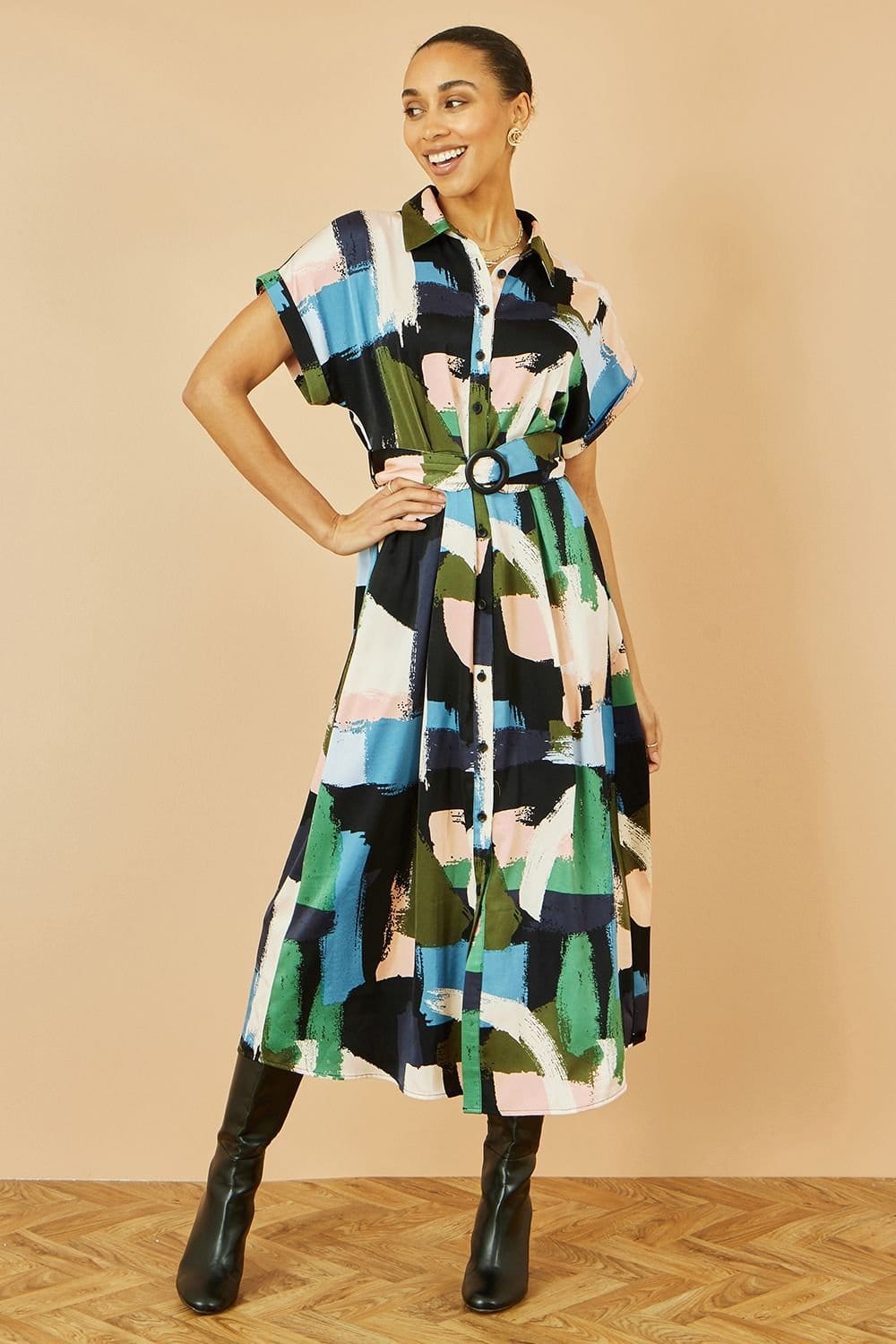 This bold and beautiful belted dress is perfect for office to weekend attire. The big brushstroke print is unique and gives a stand out look. The drop sleeve shape with button down fastening give this shirt dress its relaxed yet chic vibes.