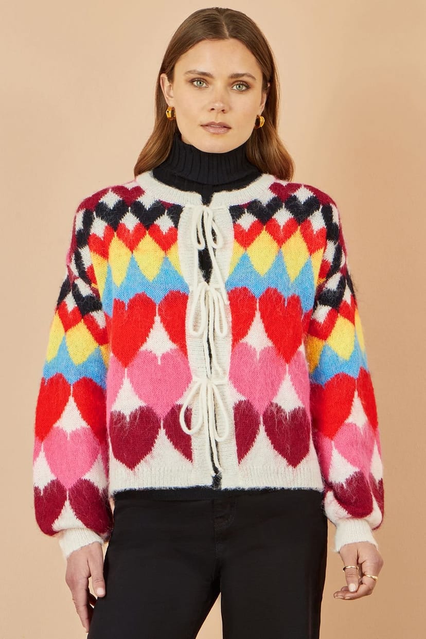 The Yumi Multi-colour Tie Front Heart Intarsia Cardigan is made from knit.