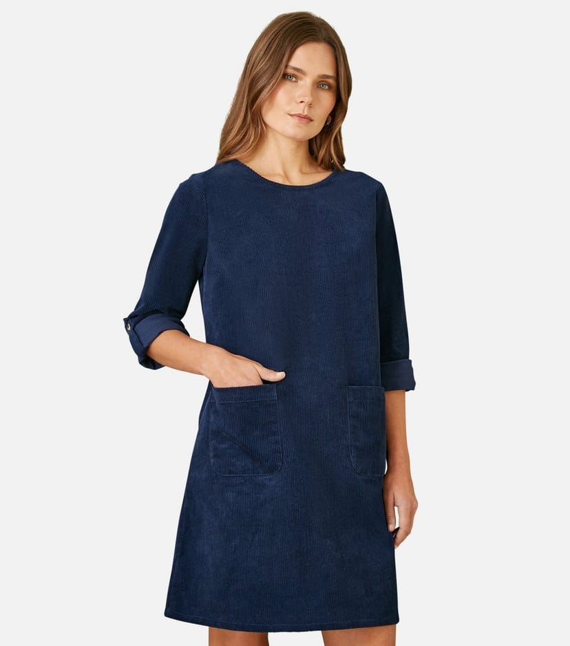 Stylish navy corduroy A-line mini dress by Yumi. Features a round neckline, three-quarter-length sleeves, and front patch pockets. Perfect for casual outings or smart-casual events.