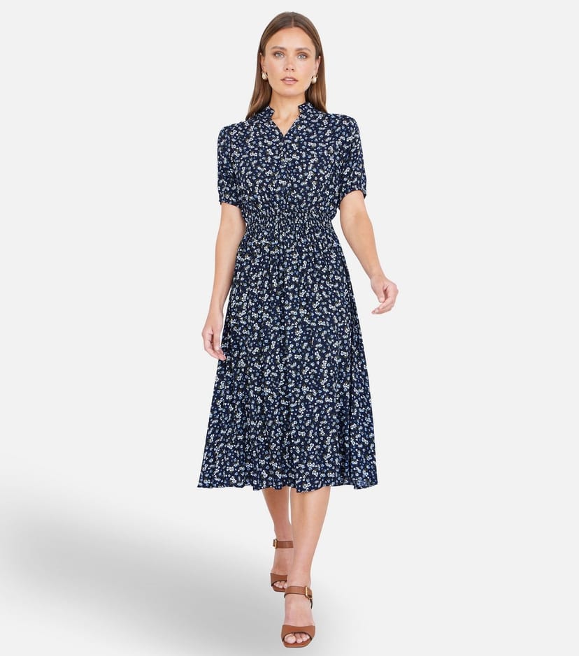 Charming floral print midi shirt dress from Yumi. Its shirred waist and soft flare make it versatile for any occasion. Ideal for both casual and dressy looks.