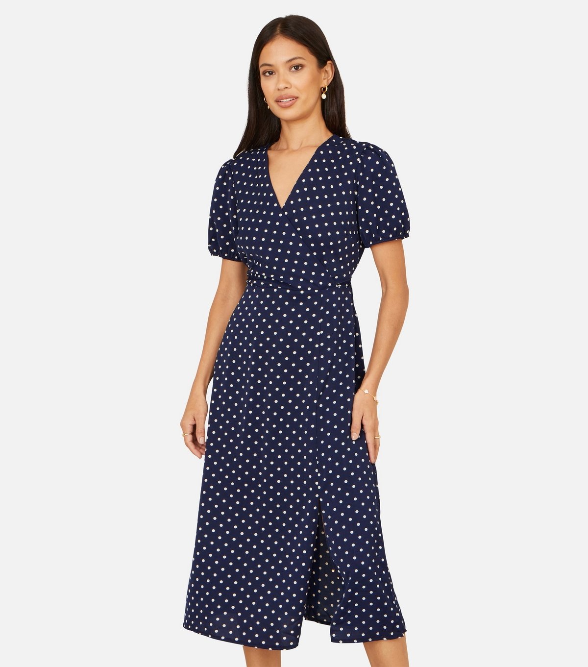 Elegant navy polka dot midi dress from Yumi. Features a flattering wrap silhouette and puff sleeves. Ideal for dressed-up occasions.