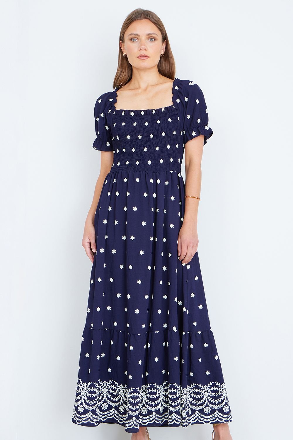 Charming navy maxi dress with an all-over white floral pattern and a beautifully smocked bodice. The puff sleeves add a soft, romantic touch, while the tiered skirt flows gracefully to a scalloped embroidered hem. Perfect for light and feminine occasions.