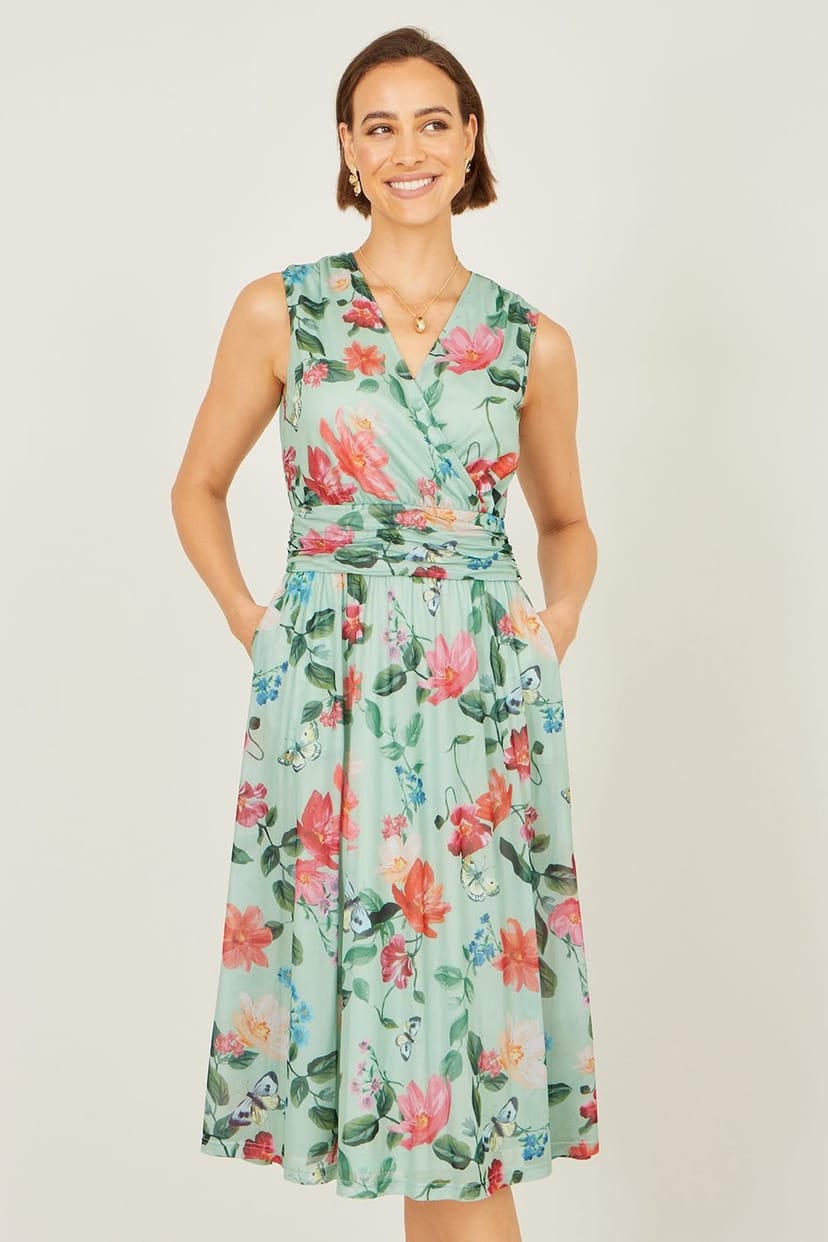 This Yumi midi dress features a blurred floral print in pale green and is crafted from stretch mesh for comfort. The skater style silhouette and ruching at the waistline add a flattering touch. Ideal for special occasions.