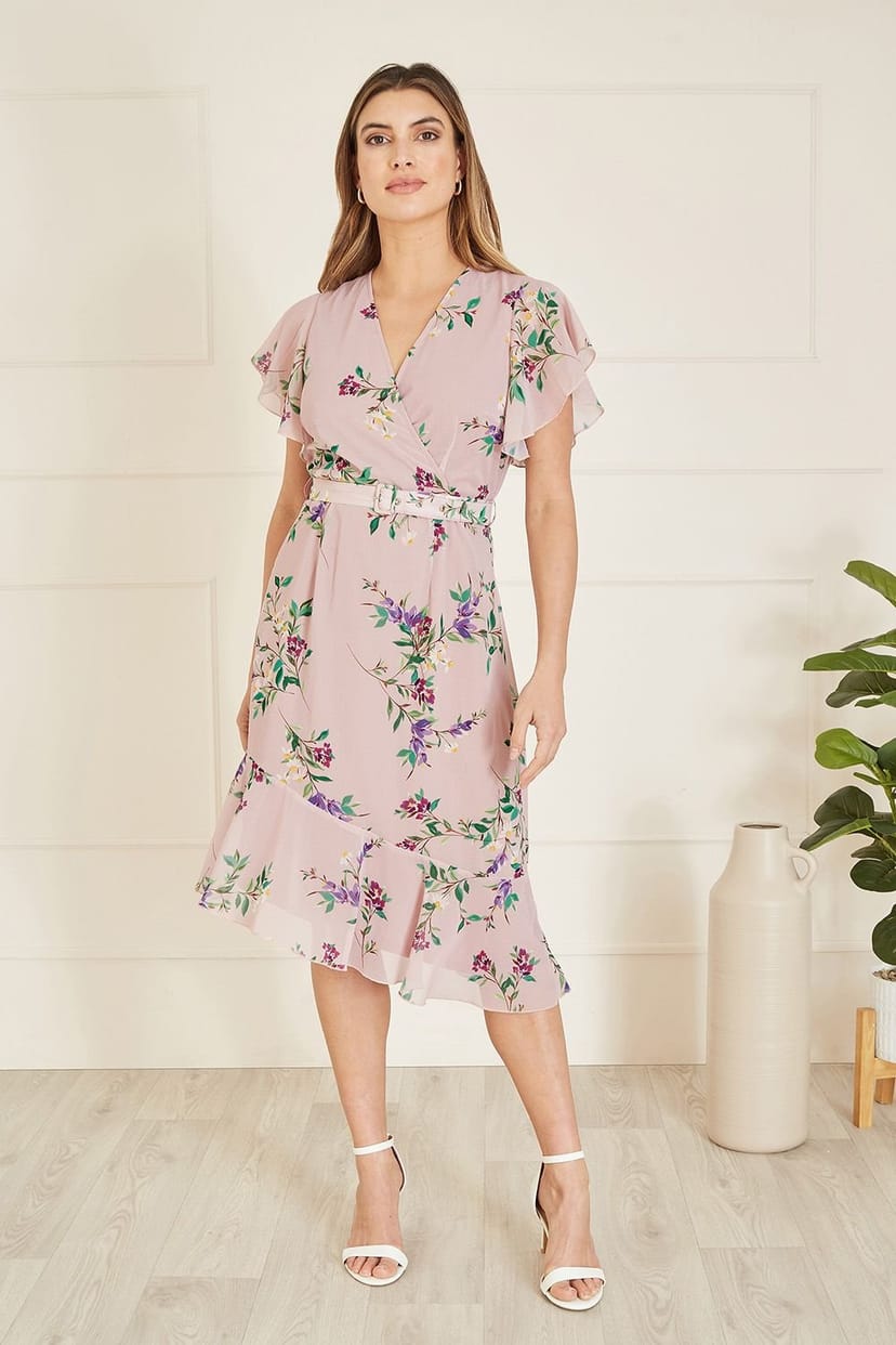 The Yumi Pink Floral Wrap Over Midi Dress With Frill Details is available in sizes 10, 12, 16, 8.