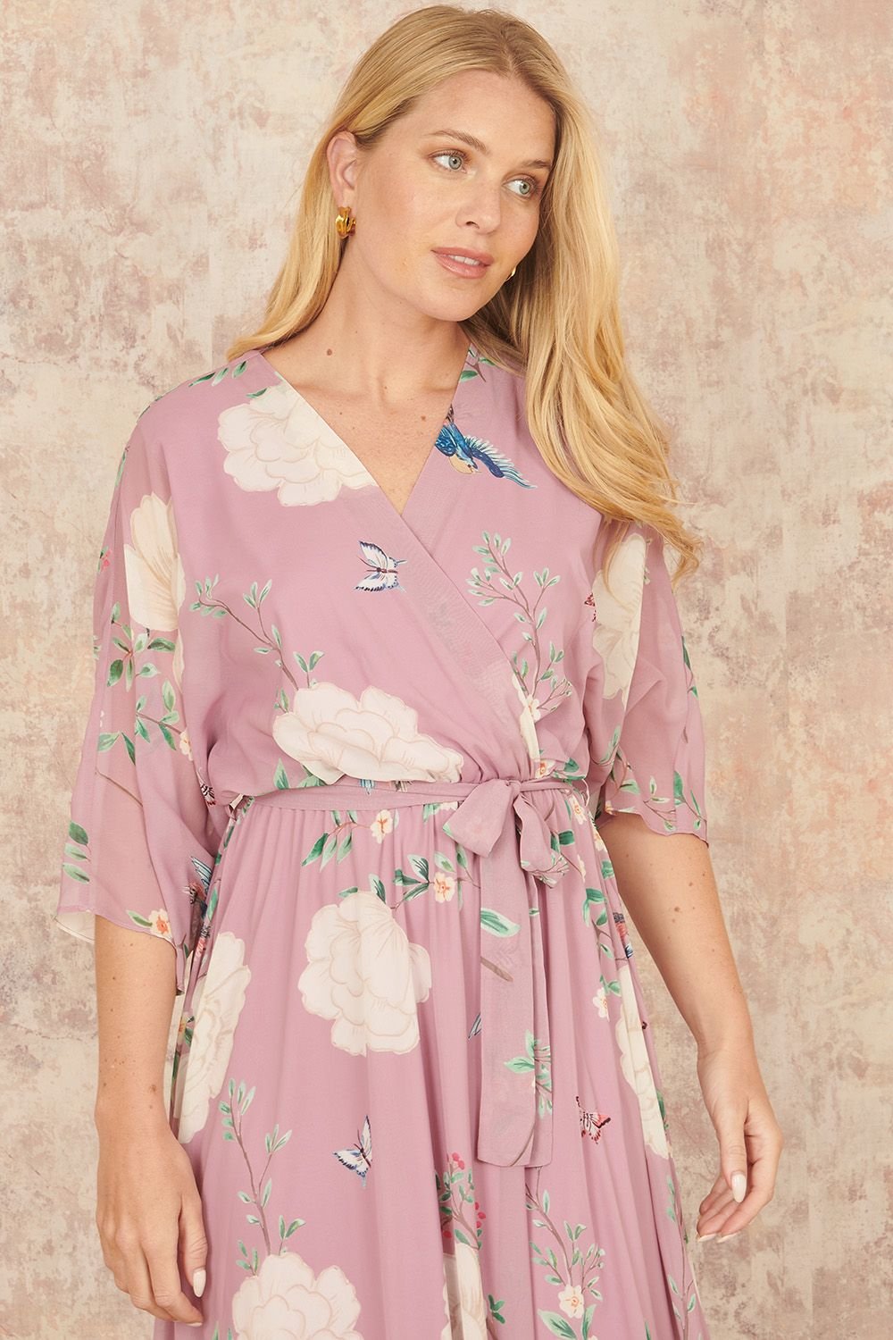 Charming midi wrap dress in pink floral print from Yumi. Features a wrap-over neckline, tie belt at the waist, and flowy midi length. The kimono-style sleeves add a flattering touch. Ideal for any special occasion.