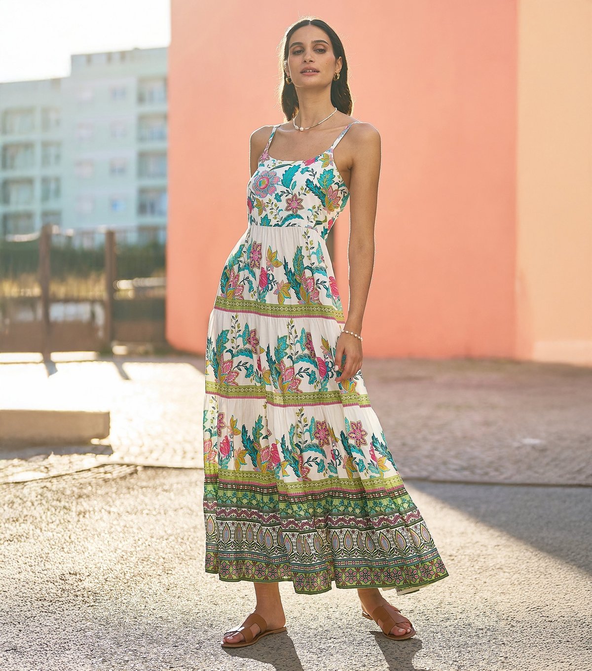 Charming midi dress in white with multicolour floral print from Yumi. Features a U-neckline and adjustable thin straps. The tiered skirt adds a playful touch, perfect for casual outings.