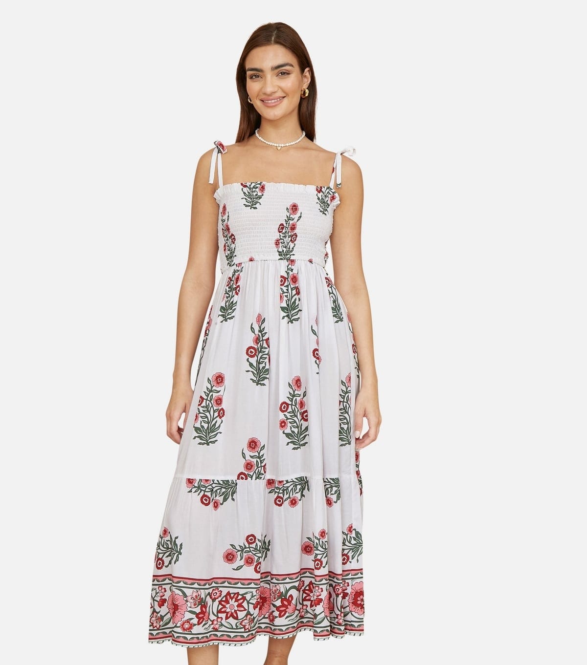 Charming Yumi midi dress in white with pink and green floral print. Features a square neckline, smocked bust, and tiered hem. Ideal for casual outings and beachwear.