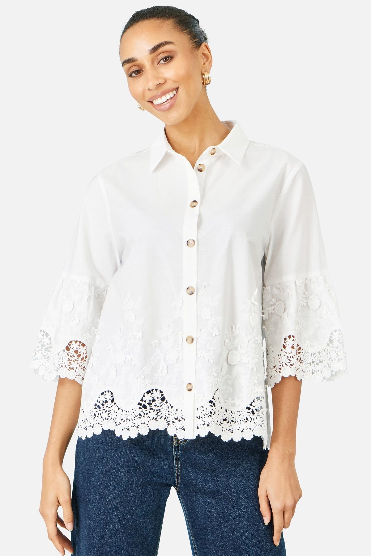 This white cotton lace border shirt brings a soft, feminine touch to everyday dressing. Made from breathable cotton, it offers a lightweight feel that's perfect for warmer days. The classic button-through front and collar are elevated with delicate lace detailing through the sleeves and hem.