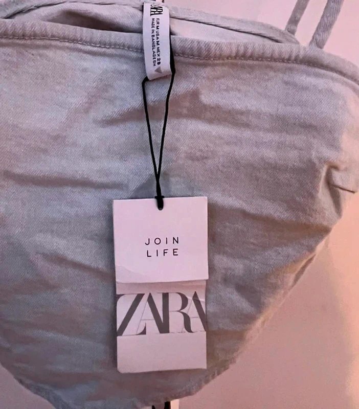 A chic strap top from Zara in light blue denim. This medium-sized piece offers a casual yet stylish look perfect for everyday wear.