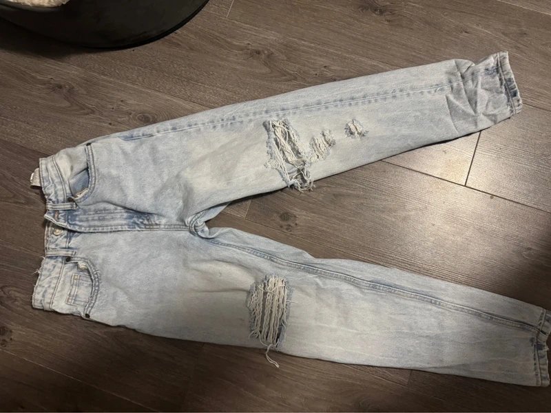 Light blue distressed jeans from Zara. Perfect for a casual look. Crafted from durable denim fabric, these jeans feature a distressed design with frayed edges and intentional wear for a trendy, edgy vibe. Ideal for everyday wear or casual outings.