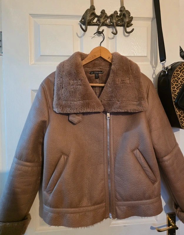 Zara's faux leather aviator jacket is a versatile addition to any wardrobe. This piece features a dusty pink/mocha colour, soft fluffy lining, and pockets for practicality. Ideal for layering, it pairs beautifully with high-waisted jeans and a chunky knit jumper.