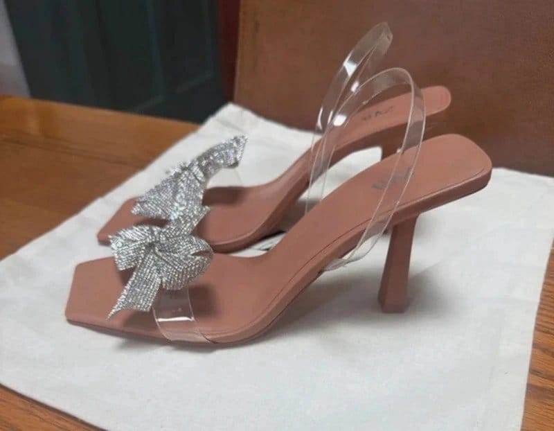 Elegant Zara sandals featuring a rhinestone bow design. Crafted in beige with silver rhinestones, these heels are perfect for prom and other special occasions.