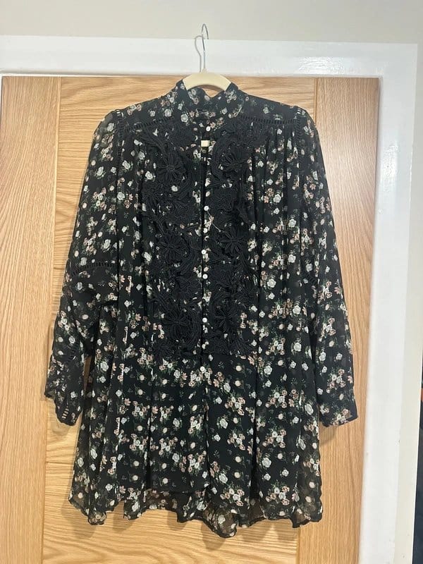 This Zara playsuit features a black floral print with lace detailing on the neckline and sleeves. The lightweight fabric and relaxed fit make it perfect for casual outings.