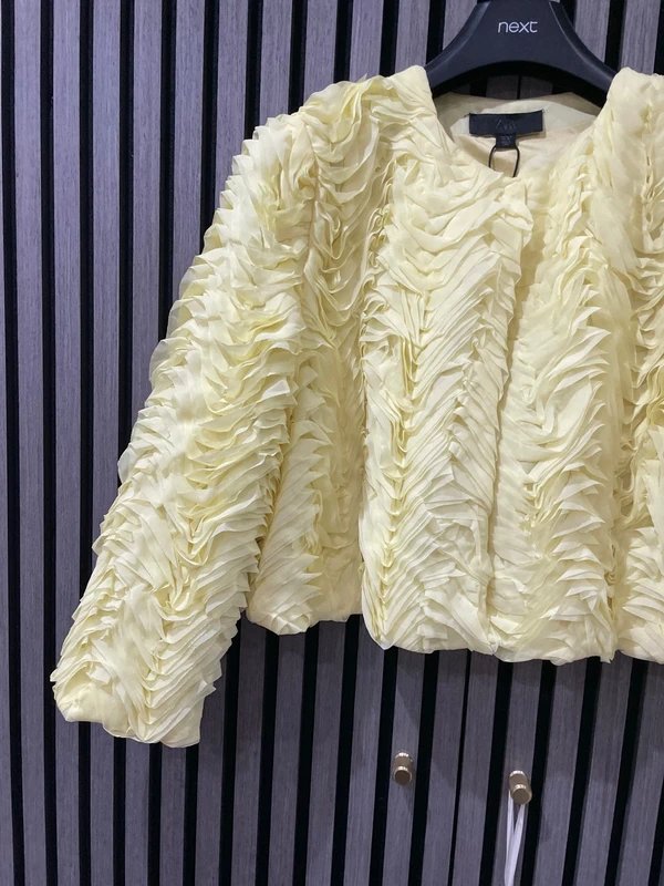 The Zara Ruffled Cropped Jacket in Yellow is ideal for summer, wedding, casual.
