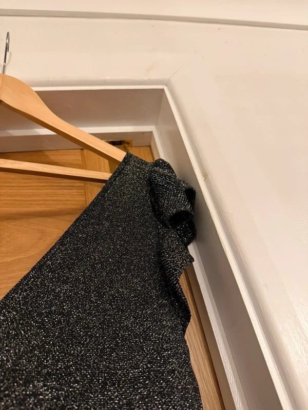“Pair with black pointed-toe ankle boots and a silver clutch bag for a glamorous evening look.”