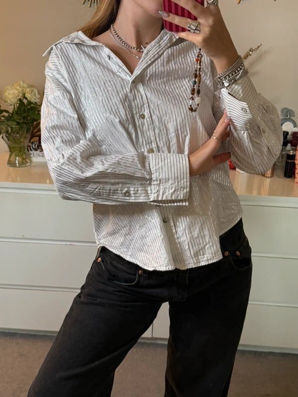 Designed with silver metallic pinstripe and mother of pearl buttons, this chic blouse offers a chic, oversized fit suitable for various occasions.